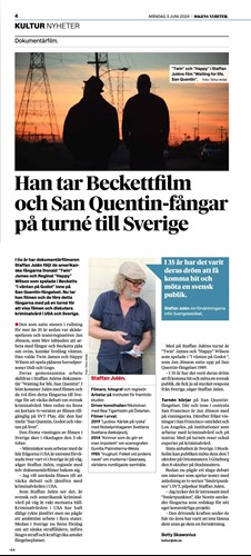 För 35 år sedan sattes Becketts i väntan på Godot upp på fängelset San Quentin med fångarna Donald "Twin" James och Reginal "Happy" Wilson i huvudrollerna. Staffan Julén, dokumentärfilmare och forskare vid IFFS har följt Twin och Happy i tio år och dokumenterat deras resa i filmen Waiting for life, San Quentin. I höst tar han med dem till Sverige för en samtalsturné om kriminalpolitik, något som Dagens Nyheter uppmärksammar.