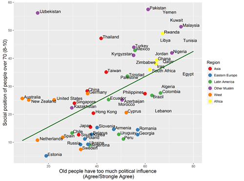 I World Values Surveys senaste intervjuomgång, vilken avslutades 2015, ombads de intervjuade att markera den sociala positionen för 20-åringar, 40-åringar och 70-åringar i sina respektive länder. Det visade sig då att 70-plussarnas sociala position skiljer sig ordentligt i olika delar av världen. I länderna i Mellanöstern och norra Afrika, den s.k. Mena-regionen, är det sociala anseendet för de äldsta som högst. Sverige däremot ligger i andra ändan av skalan.