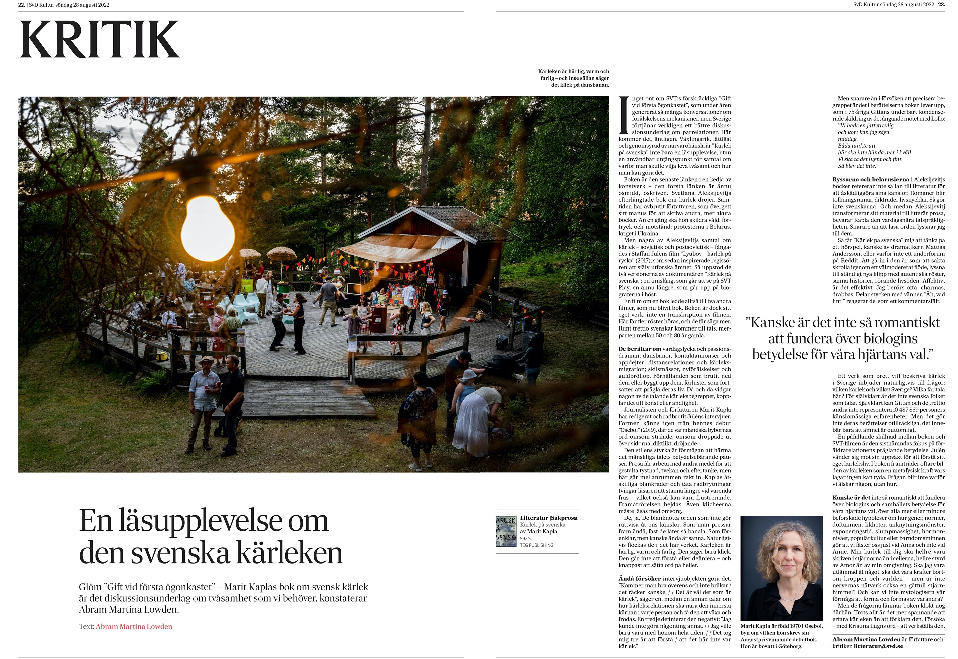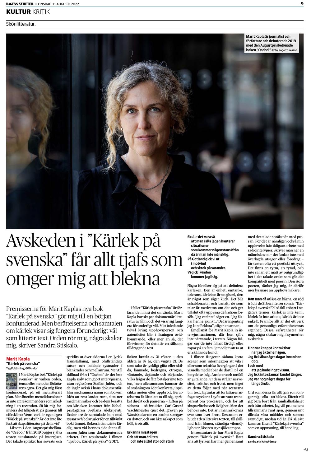 Marit Kapla var också med i Lundströms Bokradio (SR P1) den 27 augusti, och i Svenska Dagbladets recension av boken skriver kritikern Abram Martina Lowden den 28 augusti: