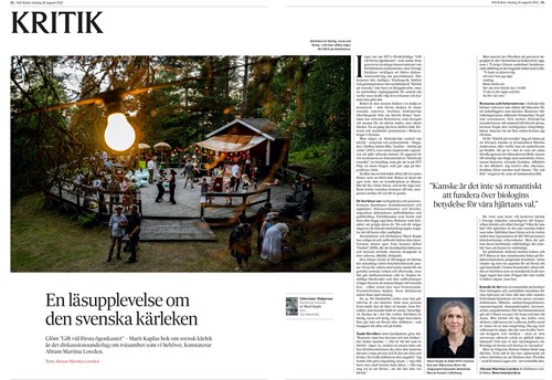 "Jag kan härmed högtidligt lova att den som öppnar Marit Kaplas nya bok Kärlek på svenska inte kommer att kunna sluta läsa. [...] Det dokumentära gör att saker sägs som ingen litterär fantasi riktigt skulle komma på eller anse värdig. Som nu den samiske man som berättar att han i sin blyga ungdom såg att en släkting till honom blundade när han dansade med en flicka på dansbanan på Jokkmokks marknad. Aha, är det så man ska göra, tänkte han och provade: ”Så jag bjöd upp. / Till slut fick jag upp någon tjej. / Sen blundade jag när vi höll på där. / Efter några varv kollade jag / då var hon borta.”