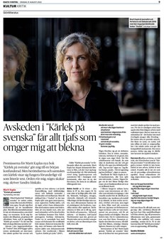 "Ord som dessa får allt tjafs som omger mig – alla – att blekna. Efteråt vill jag bara bort från samhällsståhejet och från arbetet. Jag vill promenera tillsammans runt sjön, gemensamt tillreda våra måltider och somna samtidigt, medan tid är. På så sätt kan man läsa till ”Kärlek på svenska” som en uppmaning, till handling."