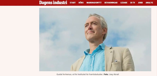 "Han är vår främsta guide in i framtiden. Som vd för Institutet för framtidsstudier är Gustaf Arrhenius Sveriges känselspröt in i morgondagen som forskar på risker och möjligheter med allt från klimatkris och artificiell intelligens till demokratins problem och kriminella samarbeten." Så börjar Dagens Industris porträtt av Gustaf Arrhenius och presentation av vårt nya forskningsprogram: Mänsklighetens vägval - demokrati, teknik, samhälle och framtida generationer.